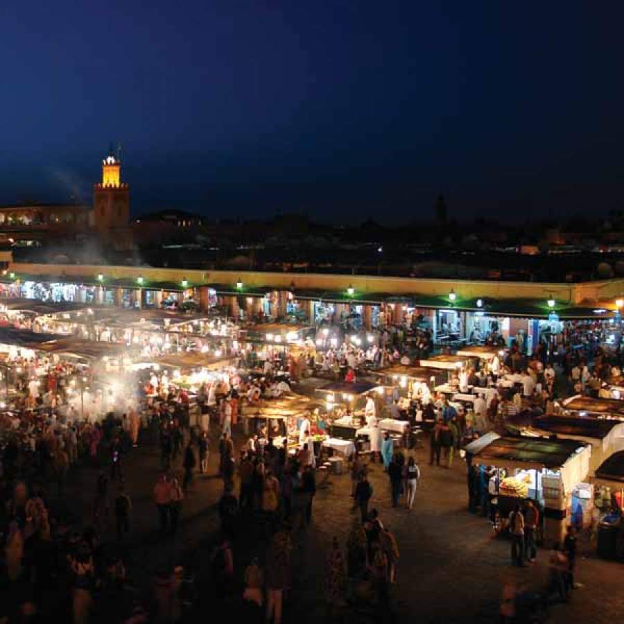 But Marrakech wasn’t always this way. There is debate about the translation of the city’s name, but some have said Marrakech means ‘leave quickly'. Its main square is known as Jamaa el-Fna—'the place of the dead'—in memory of the heads of dissidents once displayed there in warning to others. Today, it is the heart and soul of the city, an open space the size of four football fields and the perfect counterbalance to the warren of souks (markets) nearby. As the sun sets, the square erupts with humanity. Marakachis and tourists alike dine al-fresco on harira (soup), brochettes (kebabs) and hunja (cinnamon tea), while gazing onto crowds of people encircling storytellers, drumming bands and street boxing matches. A seat at a food stall is surprisingly tranquil given the tens of thousands of people gathered around you. It is the same way every night.