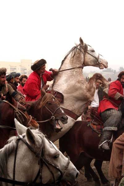 Players fight for possession of a headless goat in Afghanistan’s national sport buzkashi (translated as ‘goat-grabbing’). Two teams compete for control of a decapitated goat which they then try to drop inside a painted circle. The sport encapsulates many characteristics of the Afghan experience—strength, violence, passion and courage.