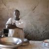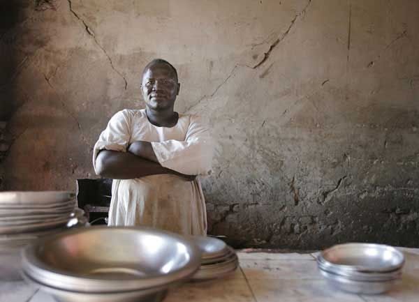A roadside cook waits to prepare a meal of goat livers and black beans with bread on the main road to Darfur in western Sudan.