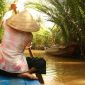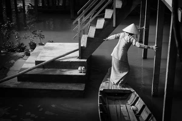 A Vietnamese woman navigates her boat around the stilt homes by pulling herself past the wooden posts. This image was shot through the window of a stilt home on the Mekong River.