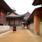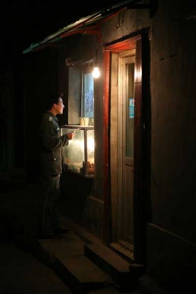 A soldier purchasing food from a local eatery. This area, which is just off of the main tourist shopping district, is a series of narrow lanes and alleys occupied by small restaurants, market stalls and eateries that cater mostly to Beijing locals.