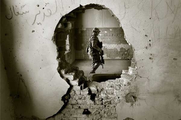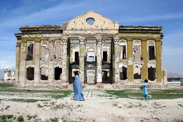 A mother walks her child home from school. The child’s dancing pose set against the backdrop of a bombed out government building perfectly sums up the unconquerable Afghan spirit.