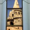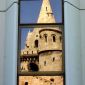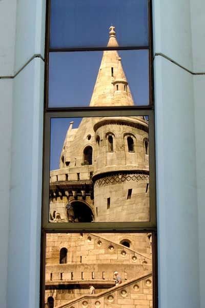 As seen in the reflection of the Hilton Hotel, visitors descend the steps of the historic Fisherman’s Bastion in Budapest, a UNESCO World Heritage Site.