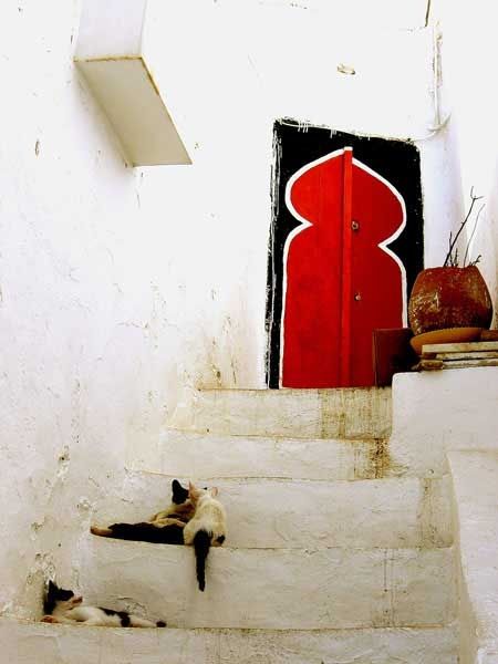 While strolling down the white washed alleys of this peaceful city, a little red door caught my eye. Three cats were relaxing on the stairs - two of them playfully teasing each other, and one left out. The image captures typical painted doors against the white city, but also a sense of the mellow streetlife, where animals lounge, the elderly sit outside watching people pass, and young people play games in the winding alleys.