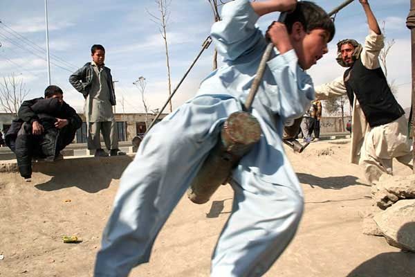 A boy enjoys an improvised swing set fashioned from old car parts in Kabul. Resourceful local people have put to good use the abandoned Soviet armoury that litters the city and countryside.