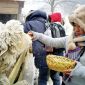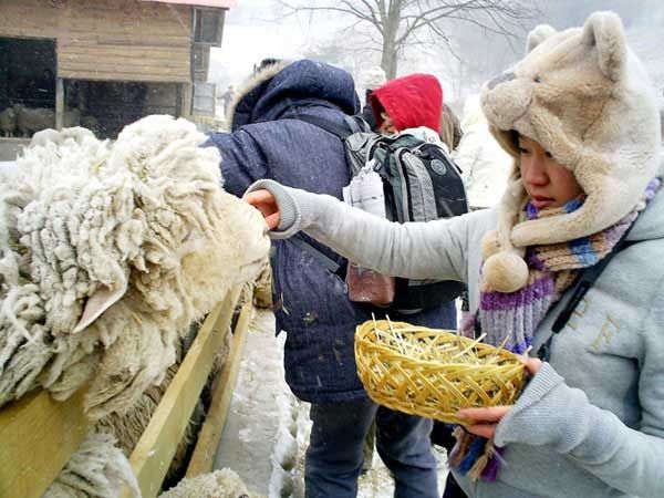 At the DKR sheep ranch, each visitor is given a basket of hay in order to feed the sheep. It took me a lot of tries to get this picture because the sheep kept moving around. When we left, the snow on my bear hat began to melt—it looked like it was crying. Our guide said it must be sad to leave the sheep.