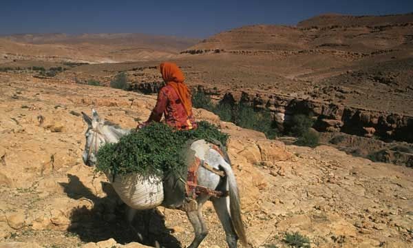 A woman makes a long journey home, carrying vegetation for her flock of sheep. There was no greenery within an hour of her location, and the nearest village was more than two hours away—quite a journey for a few strands of greenery.