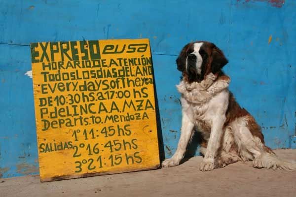 On a chilly day in the Andes Mountains, this St. Bernard's coat affords him some much-needed warmth. Being on the major road through the Andes between Chile and Argentina, this town sees a lot of buses heading through and makes it easy for anyone caught out here to catch one.