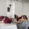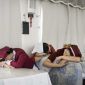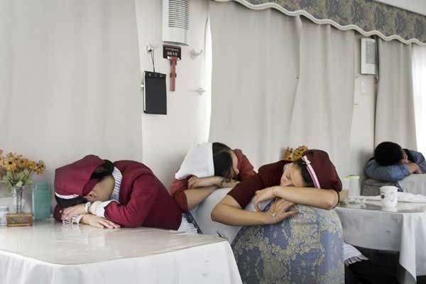 Servers in the food car of the train from Chengdu, China to Lhasa, Tibet. As the train climbs higher in altitude, the thinner air often results in fatigue. This image was taken in the mid-afternoon when the food car was empty of hungry passengers.
