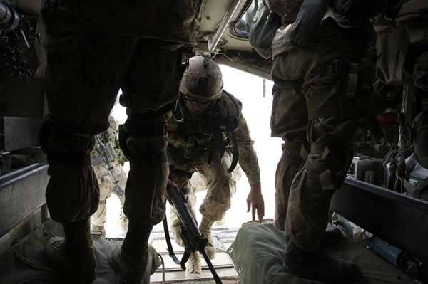 Soldiers climb aboard an armoured personnel carrier at the Gumbad Safe-house in southern Afghanistan. The convoy was unable to reach Kandahar Air Field (KAF) the previous day, when a roadside IED bomb attack left four soldiers dead in front of the vehicle I was travelling in.