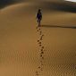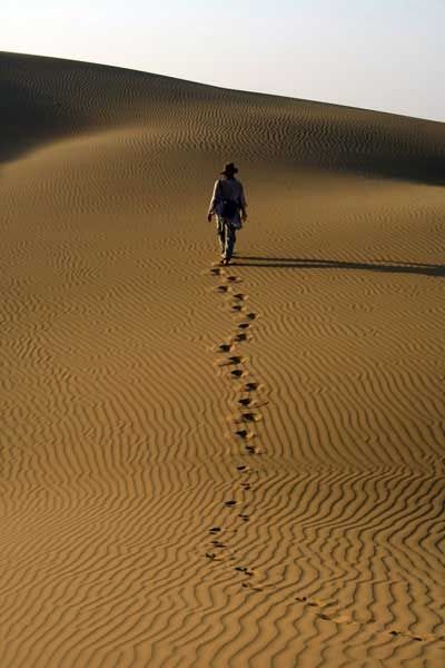 Trail of footsteps through the sand dunes; taken while on a camel safari in the desert.