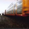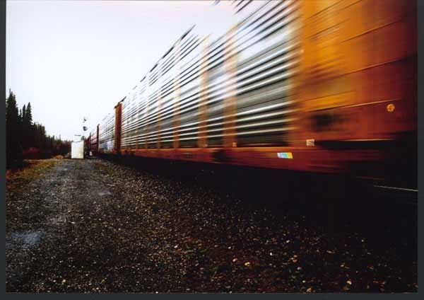 A Canadian Pacific Railway (CPR) train on a rainy day in April. The image intended to capture its greatness and the high speed at which the train was going. But it can be symbolic as well: like the train passing by, life is fast-paced, and if you don’t jump on it, it might pass you by.