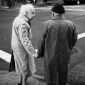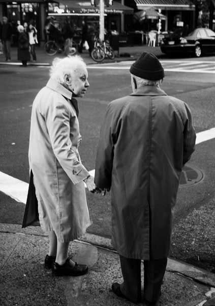 An elderly couple waits to cross the street on a cool fall day in New York City. The pair is very engaged with each other and seem oblivious to the rest of the world around them. Their short walk seemed to be part of a long journey together.