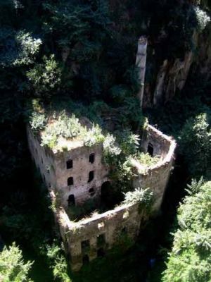 This photo was taken in Sorrento, Italy, a short walk from Piazza Tasso and the harbour. These are mill ruins, dating to the early 900s, located in a deep gorge. The picture was taken from a road that overlooked the gorge.