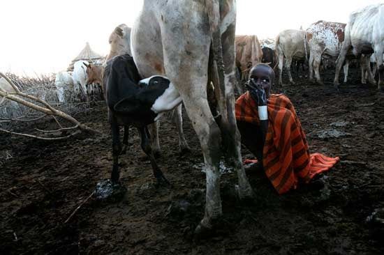 A boy shares milk with a calf in a manyata—a traditional family Karamojong home. These people follow a traditional lifestyle of semi-nomadic cattle herding. However, their way of life is being disrupted by the introduction of weapons into their communities from neighbouring Sudan and the Acholi region of Uganda. These weapons are being used in place of spears during cattle disputes and raiding between cattle herders.