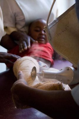 A young patient reacts to the sight and sound of the saw used to remove his cast. Every Wednesday morning at Nkuru Iziza casting treatment is offered to patients with congenital deformities such as clubfoot and knock-knees. Removing a plaster cast is not painful, but the sight and sound of a circular saw used to remove the cast can be a frightening experience.