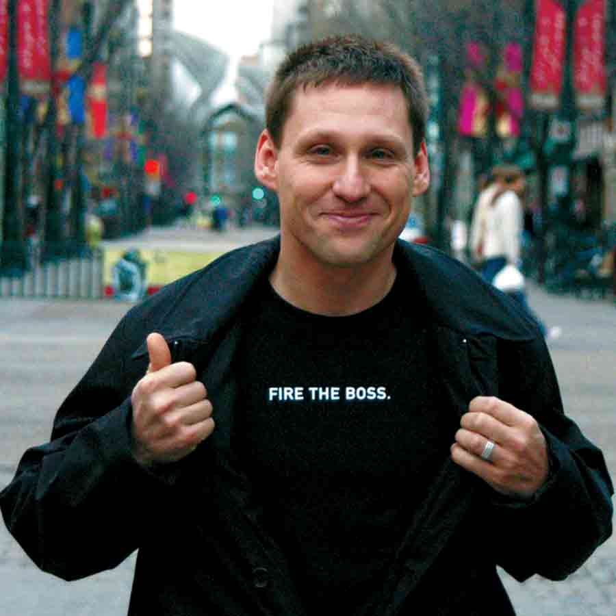 “You don’t have freedom of expression in your workplace,” he continues. “Try telling your boss exactly what you think of her. You don’t have freedom of association in your workplace. You can’t just get together with 25 of your fellow workers at any time of the day in the workplace and discuss everything that’s screwed up about it. And you certainly don’t have equality rights in the workplace, because you see people with less talent and better ass-kissing skills making more money than you do.”