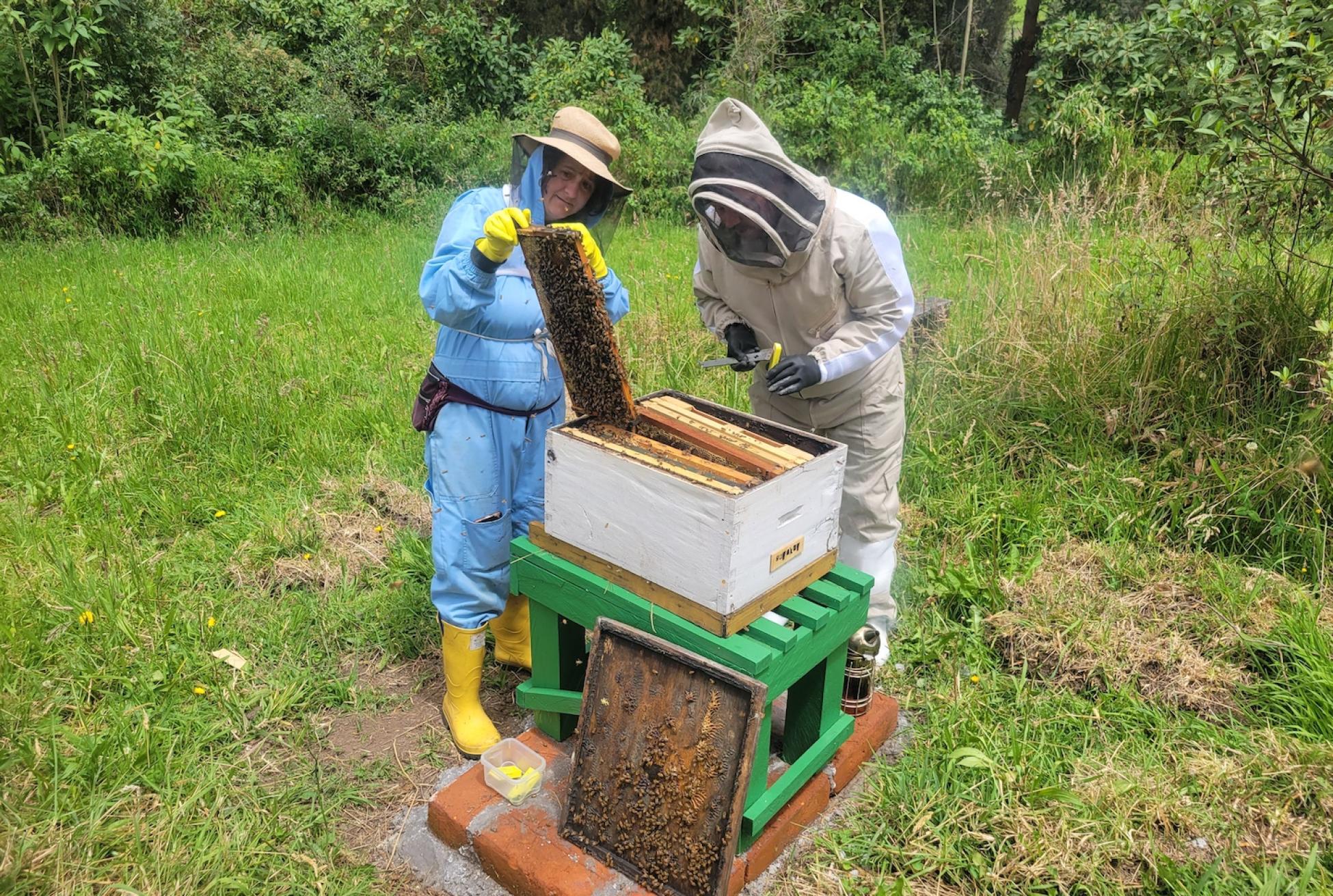 The first step in the lengthy process of apiary work preparation was putting on the suit and veil. The mesh net was placed over my head and ties across my chest. The large blue suit made me feel as if I had just stepped into an episode of Breaking Bad. The similarities between meth cooking and Ecuadorian beekeeping stopped there. One of the most crucial parts of beekeeping is using the bee smoker. The bee smoker can quite literally be the difference between a welt-covered and not-welt-covered hand as it calms the swarms with each puff.